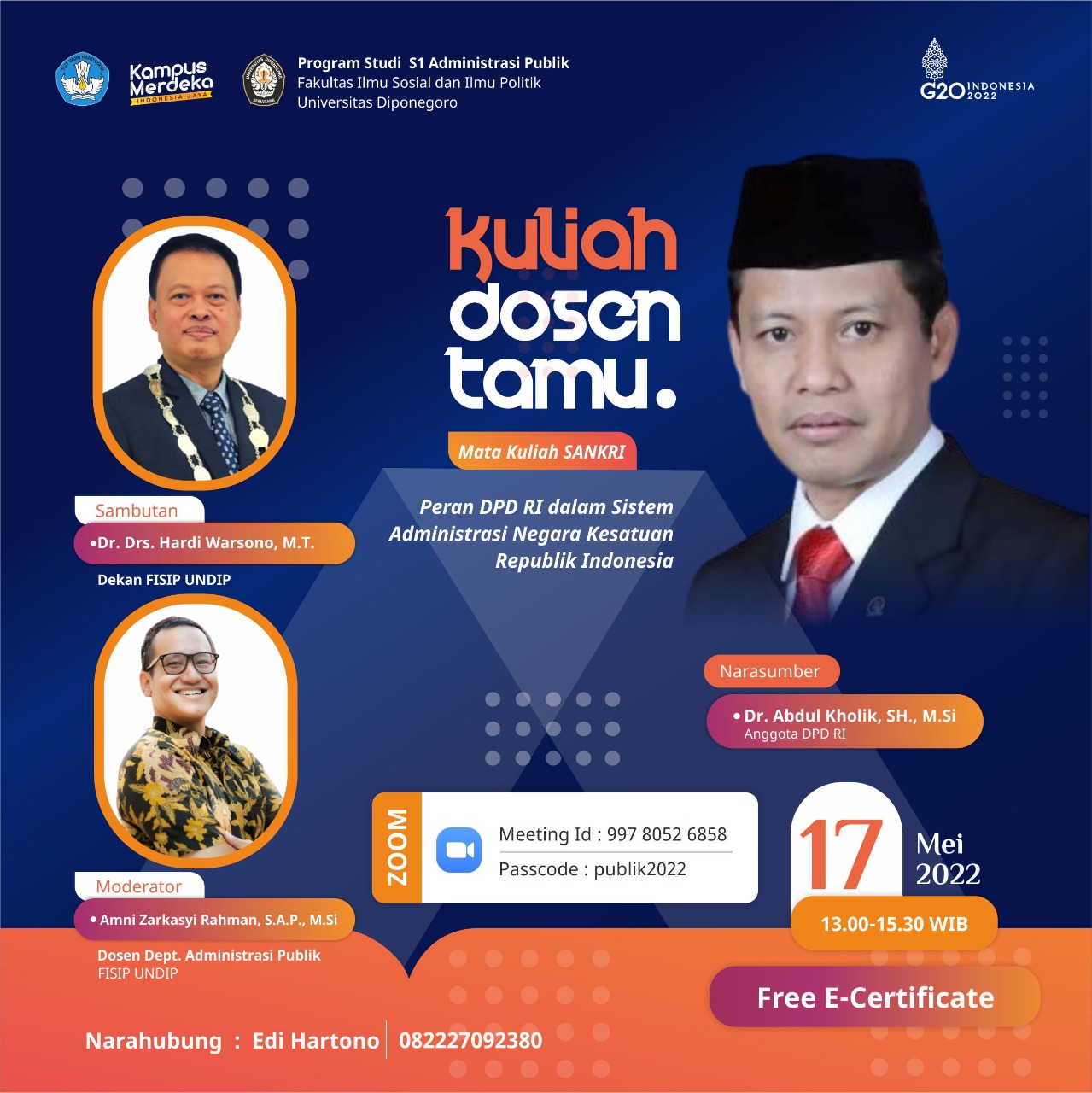 Anggota DPD RI Dr. Abdul Kholik., M.Si Menjadi Narasumber di Kuliah Dosen Tamu FISIP UNDIP