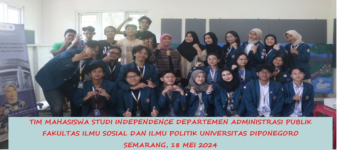 Sabtu, Tanggal : 18 Mei 2024 tim mahasiswa studi independence Prodi S1 Administrasi Publik melaksanakan rangkaian kegiatan dalam rangka turut berperan mengembangkan pariwisata khususnya di Pokdarwis Bukit Senja kelurahan Tembalang kota Semarang. Topik yang diangkat pada kegiatan ini antaralain tentang Digital Tourism: ” Solusi berwisata dengan pemanfaatan digital tourism dalam pengembangan wisata bukit senja”. Target atau sasaran peserta kegiatan adalah anggota karang taruna di RW 08 di kelurahan Tembalang.Kegiatan ini didampingi oleh Dr.AP.Dra.Tri Yuniningsih,MSi ( Ketua Departemen Administrasi Publik/ Dosbing ) diikuti oleh 20 orang mahasiswa Prodi S1 Administrasi Publik semester empat ( Angkatan 2022).