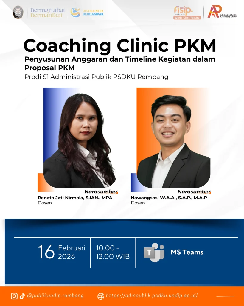 Rembang, 5 Januari 2026 — Program Studi Administrasi Publik PSDKU Rembang, Universitas Diponegoro kembali memperkuat ekosistem akademik dan kreativitas mahasiswa melalui penyelenggaraan Coaching Clinic PKM bertema “Penyusunan Proposal Berbasis Data dan Dampak.” Kegiatan ini dirancang sebagai ruang pembelajaran sekaligus pendampingan praktis bagi mahasiswa dalam menyusun proposal PKM yang lebih tajam, terukur, dan relevan dengan kebutuhan […]
