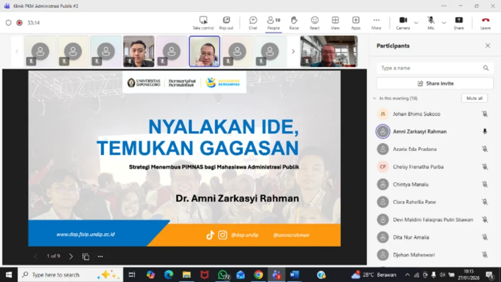 Selasa, 27 Januari 2026 lalu Program Studi Administrasi Publik, Departemen Administrasi Publik, Fakultas Ilmu Sosial dan Ilmu Politik (FISIP) Universitas Diponegoro menyelenggarakan Klinik PKM (Program Kreativitas Mahasiswa) Series 2. Kegiatan ini merupakan keberlanjutan dari rangkaian Series Klinik PKM Program Studi Administrasi Publik. Klinik PKM merupakan bagian dari kegiatan Laboratorium Kebijakan dan Manajemen Organisasi Publik, yang […]