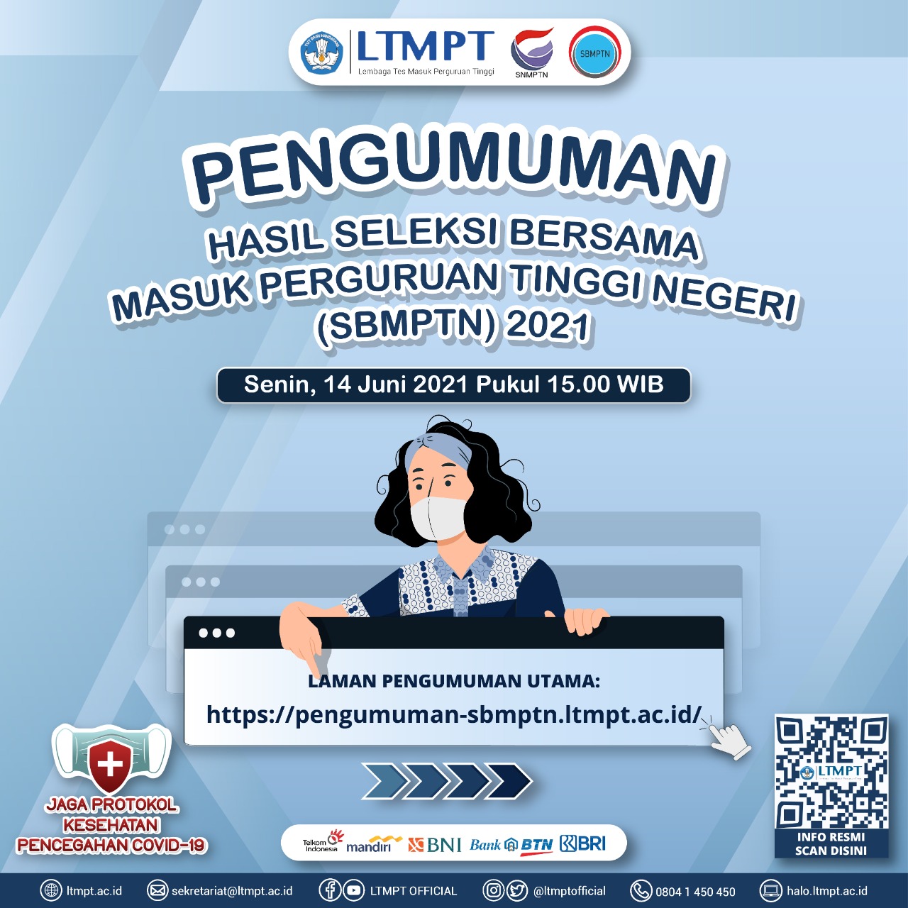 Announcement of the 2021 LTMPT SBMPTN Selection Results can be accessed starting on June 14, 2021 at 15.00 WIB through the link below: