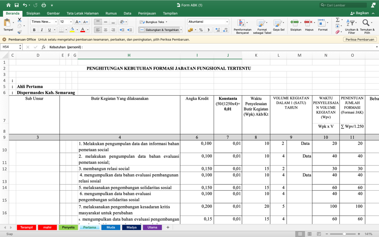 The implementation was divided into two stages: inventorying and counting. The main thing to do is to make an inventory of activity items. These activity items are activities that must be achieved by functional officials. After the activity points are compiled, it affects the appearance of credit numbers. The role of the intern at the inventory stage is to add activity items that have not been listed in the file and convert credit numbers into decimal numbers in accordance with the directions received. The calculation stage is divided into several parts, namely calculating the Time for Completion of Activity Items (Wpk), calculating the volume of each activity for each level of functional position in one year, calculating the Wpv of each activity for each level of functional position, calculating the number of position formation needs, and calculating position formation vacancies. In this second stage, the role of the intern is to calculate each preparation of the implementation of position formation requirements until the final result appears, marked by rounding. The expectation for the implementation of the calculation of position formation needs, especially at the Community