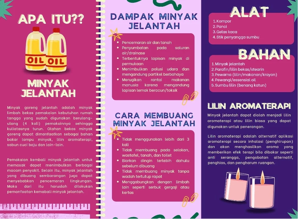 Cooking oil is a basic necessity widely used in households. However, cooking oil reused multiple times turns into waste oil, known as minyak jelantah, a common household waste product. Improper disposal of this waste oil often leads to environmental pollution, affecting soil, water, and more.
