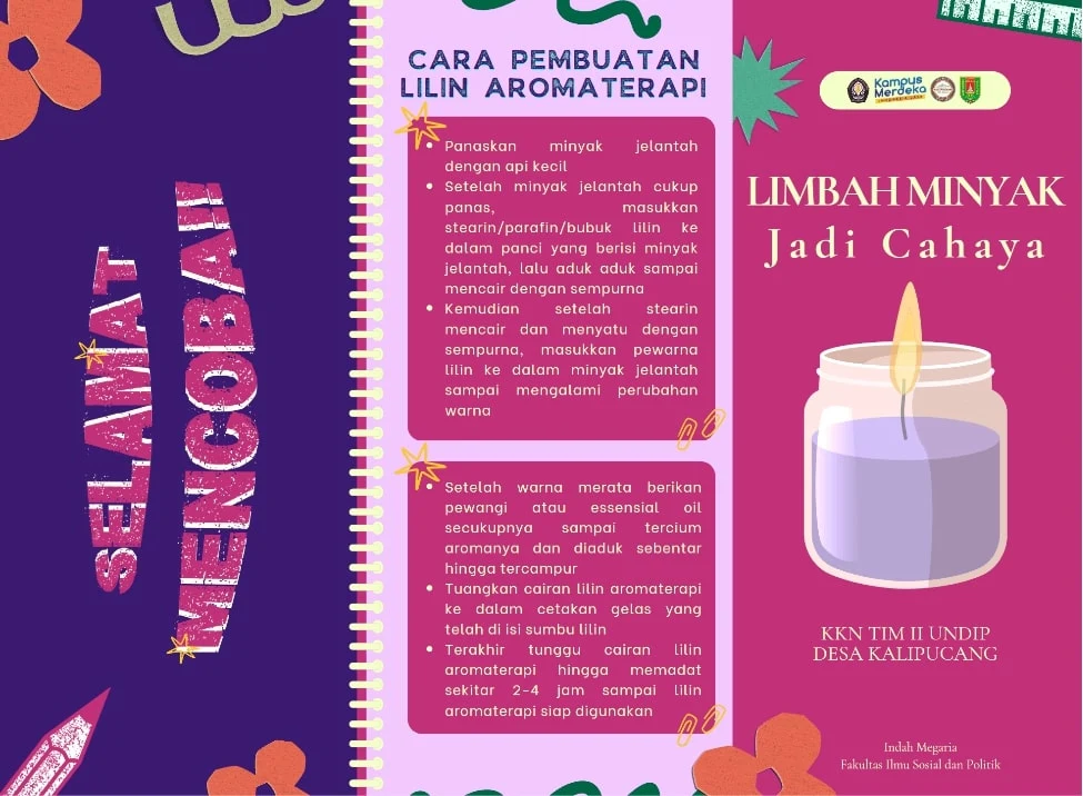 Kalipucang Village, Grabag (August 4, 2024) – Indah Megaria, a student from Universitas Diponegoro’s KKN (Community Service Program) Team II for 2023/2024, successfully transformed waste cooking oil into aromatherapy candles. This initiative was part of a mono-disciplinary work program aimed at empowering the community through training and demonstrations on recycling used cooking oil into aromatherapy candles, conducted with members of the women’s empowerment group (TP PKK) in Kalipucang Village, Grabag Subdistrict, Magelang Regency.