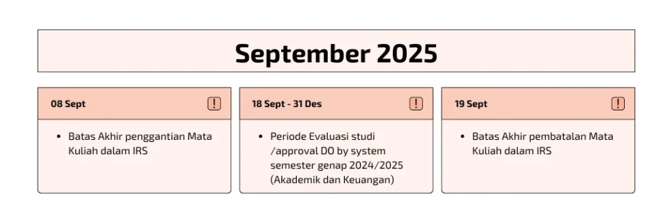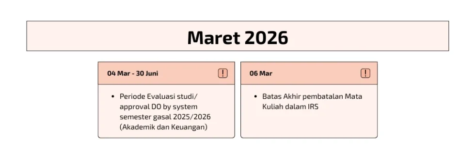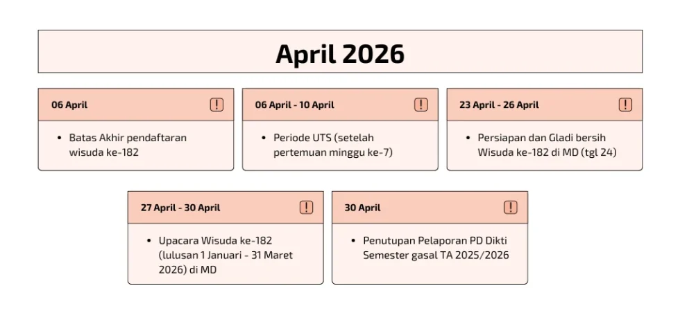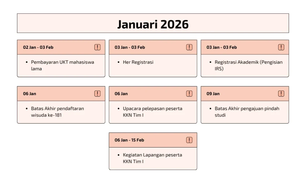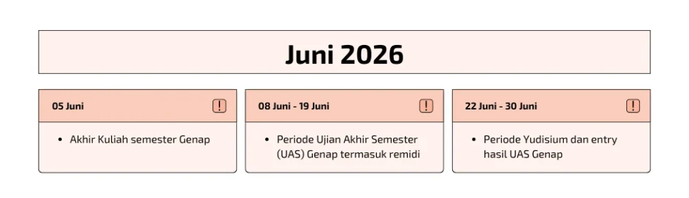 Semester Genap TA 2025/2026 dimulai pada Januari dengan jadwal pembayaran UKT, her-registrasi, dan pengisian IRS. Februari diisi dengan Wisuda ke-181 dan dimulainya perkuliahan pada 9 Februari. Maret hingga April merupakan periode evaluasi studi dan UTS, serta pelaksanaan Wisuda ke-182. Perkuliahan berakhir pada 5 Juni, dilanjutkan dengan UAS hingga 19 Juni, dan ditutup dengan proses yudisium serta entri nilai pada akhir Juni.