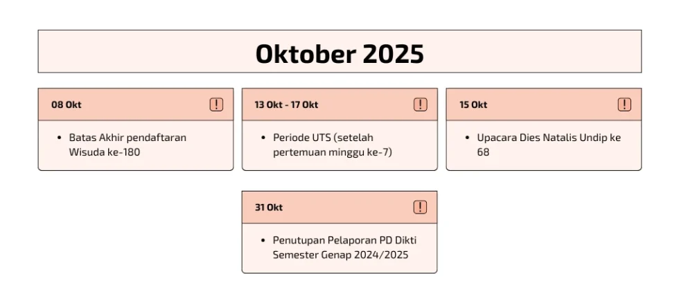 Semester Gasal TA 2025/2026 dimulai sejak Juli dengan periode pembayaran UKT, her-registrasi, dan pengisian IRS. Bulan Agustus diisi dengan kegiatan Penerimaan Mahasiswa Baru, PKKMB, serta dimulainya perkuliahan pada 25 Agustus. Evaluasi akademik dan kegiatan UTS dijadwalkan pada September–Oktober, disusul wisuda periode ke-180 dan peringatan Dies Natalis Undip. Perkuliahan berakhir pada 12 Desember, dilanjutkan UAS hingga 24 Desember, dan ditutup dengan yudisium akhir tahun.