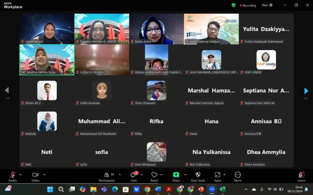 Semarang, 28 November 2024 – Program Studi S1 Administrasi Publik, Fakultas Ilmu Sosial dan Ilmu Politik (FISIP), Universitas Diponegoro menyelenggarakan Webinar Alumni bertajuk “Navigating Life After Graduation“. Acara yang berlangsung pada pukul 19.00 WIB ini dilaksanakan secara daring melalui Zoom Meeting dan dihadiri oleh mahasiswa, alumni, serta dosen.