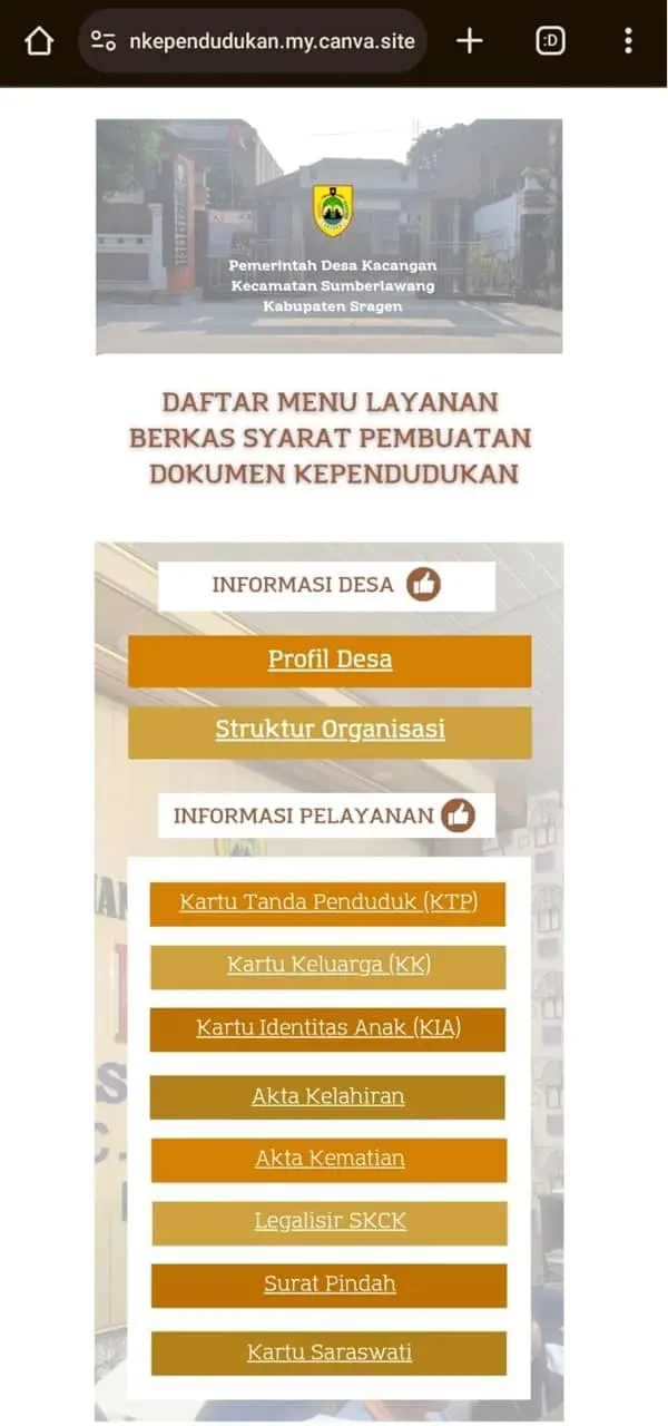 Kepala Desa Kacangan, Pak Ladiyo, sangat mendukung dan mengapresiasi adanya canva site ini. Beliau berharap hal ini merupakan langkah awal yang bagus untuk menerapkan SPBE (Sistem Pemerintahan Berbasis Elektronik) di Desa Kacangan dengan kemudahan mengakses informasi berkas yang dibutuhkan untuk membuat dokumen kependudukan hanya dengan “klik” dari perangkat masing-masing.