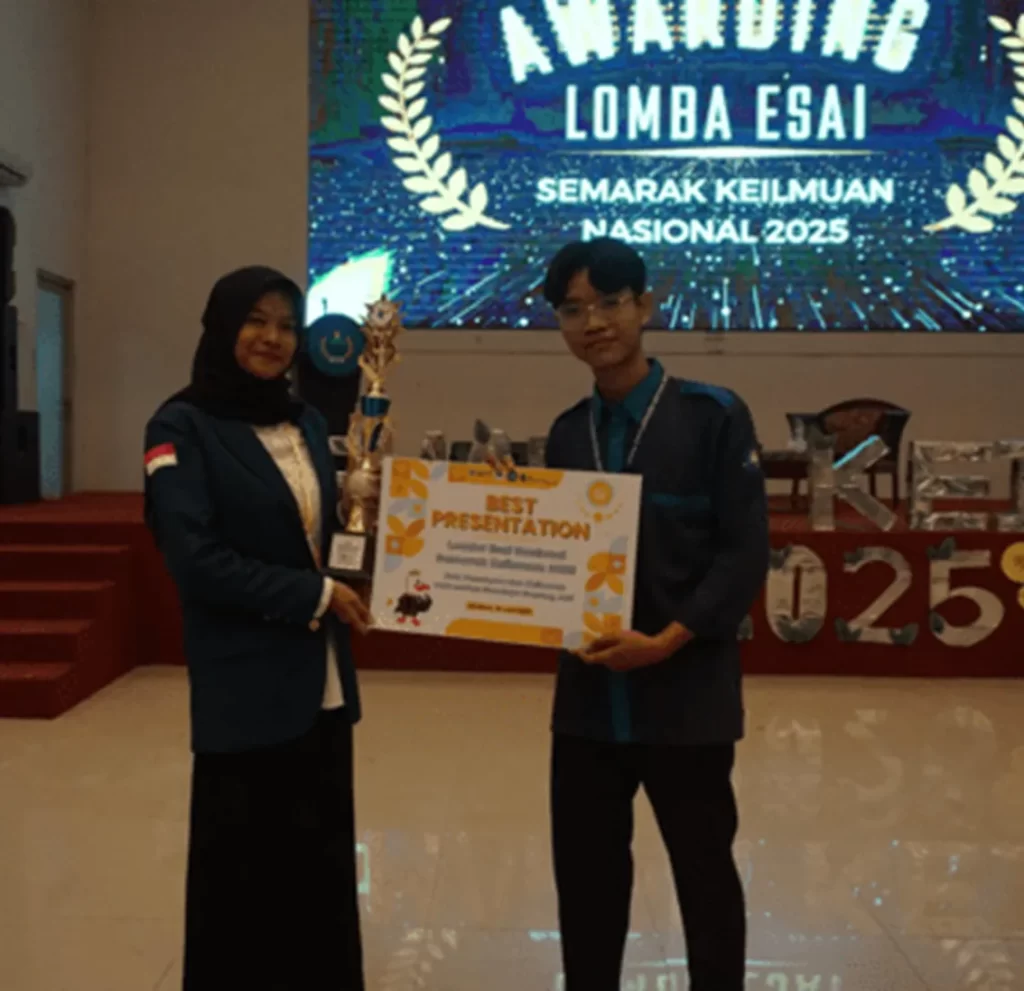 Semarak Keilmuan 2025, organized by Swadaya Gunung Jati University’s Student Scientific Reasoning and Knowledge Unit, aimed to enhance students’ creativity in scientific writing. Participants were required to present solution-oriented ideas in a scientific essay, followed by a presentation before the panel of judges. Fara Nur Aliya submitted an essay titled “LAUTARA (Autonomous Tracker and Resilient Authority): Robotic-Based IoT Integration as a Mitigation Strategy Against Illegal Fishing to Achieve Indonesia’s Maritime Resilience.” Her work passed the initial selection stage and outperformed dozens of papers from top universities. In the final round in Cirebon, Fara confidently presented her idea, demonstrating research skills, critical analysis, and systematic, communicative delivery.