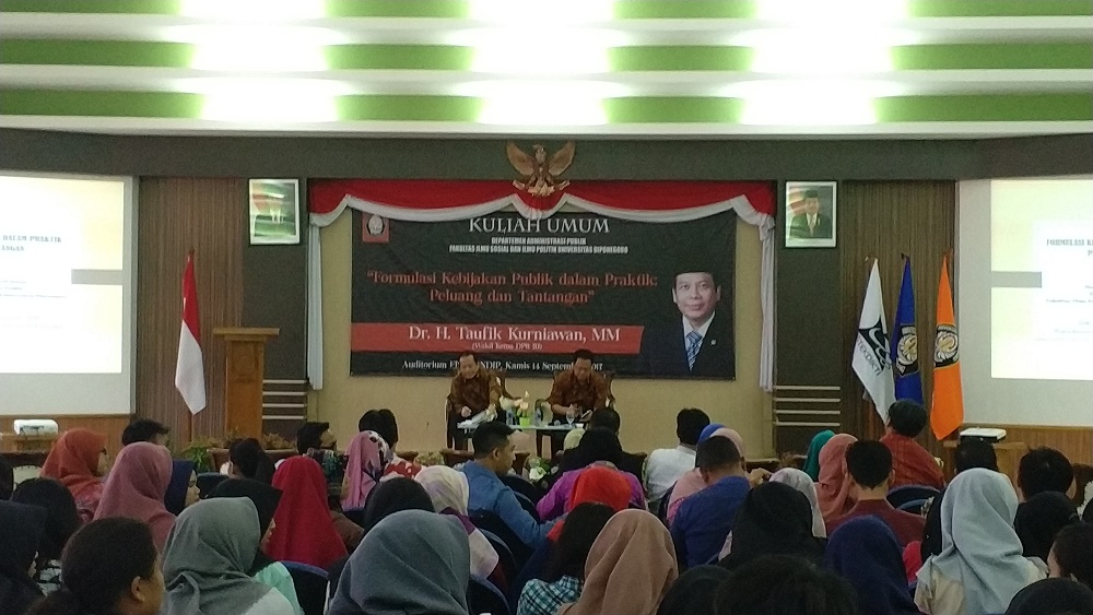 Tantangan makro nasional adalah kebijakan reformasi anggaran dan pembiayaan pembangunan Indonesia. Hal tersebut disampaikan oleh Wakil Ketua DPR RI Taufik Kurniawan saat menyampaikan Kuliah Umum di Fisip Undip, Kamis (14/9). Kuliah ini mengambil tema “Formulasi Kebijakan Publik Dalam Praktek: Peluang dan Tantangan”. Wakil Ketua DPR Bidang Ekonomi dan Keuangan ini menyampaikan, untuk melakukan kebijakan reformasi anggaran dan pembiayaan pembangunan Indonesia langkah-langkah yang perlu dilakukan adalah mendorong ruang kebijakan anggaran yang lebih luas, sehingga pengelolaan keuangan negara baik yang di kelola langsung oleh pemerintah maupun melalui institusi non-pemerintah, dapat menjadi bagian dari kebijakan anggaran yang harus memenuhi prinsip efisiensi, efektifitas, transparansi dan akuntabilitas.