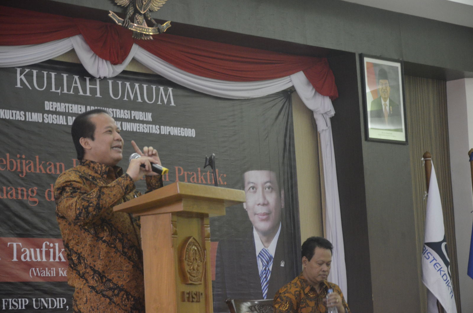 Dekan Fisip Undip Dr.Sunarto mengatakan merasa sangat senang atas kedatangan Wakil Ketua DPR RI Dr.Ir.Taufik Kurniawan,MM untuk memberikan kuliah umum di Fisip Undip ini karena akan sangat bermanfaat sekali untuk menambah dan memperdalam tingkat keilmuan para mahasiswa khususnya mengenai kebijakan administrasi Negara,” ujarnya.